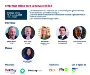 Aques 18 de juny s’ha celebrat el diàleg online “Empreses ètiques per a la nova realitat” organitzat per beethik, co-resol i Fortuny Legal, amb la col·laboració de la Fundació Factor Humà y DIRSE i el suport tècnic de la UOC, per reflexionar sobre per què i com les empreses han d’integrar la perspectiva ètica en la seva gestió en la nova realitat.